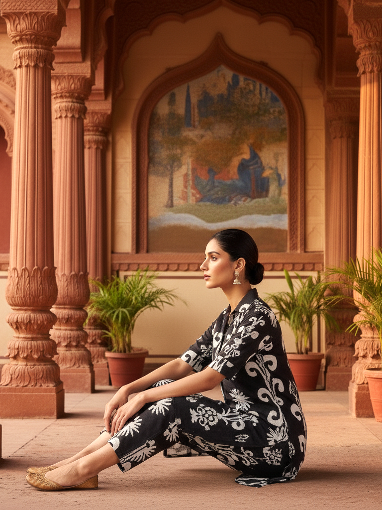 Elevate your everyday style with this elegant black and white floral print co-ord set. Crafted in breathable 100% cotton fabric, this set features a button-down long kurta with shirt collar and straight pants for a modern yet traditional appeal. Perfect for casual outings, office wear, or festive gatherings, this co-ord set combines comfort with chic sophistication. Pair it with juttis or heels for a versatile look.