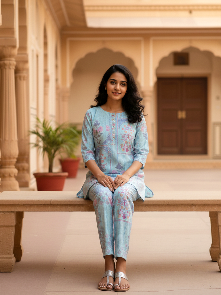 This comfortable and chic Tunic and Trouser Co-ord Set is perfect for elevated loungewear or travel. The short tunic top features a collared neckline and a button placket, styled like a short shirt-kurta. It's paired with matching straight-fit trousers. Both pieces showcase intricate, traditional-inspired patchwork and floral prints in soothing color palettes like Soft Pink or Aqua Blue. It's a modern take on ethnic style that prioritizes ease of movement and comfort.