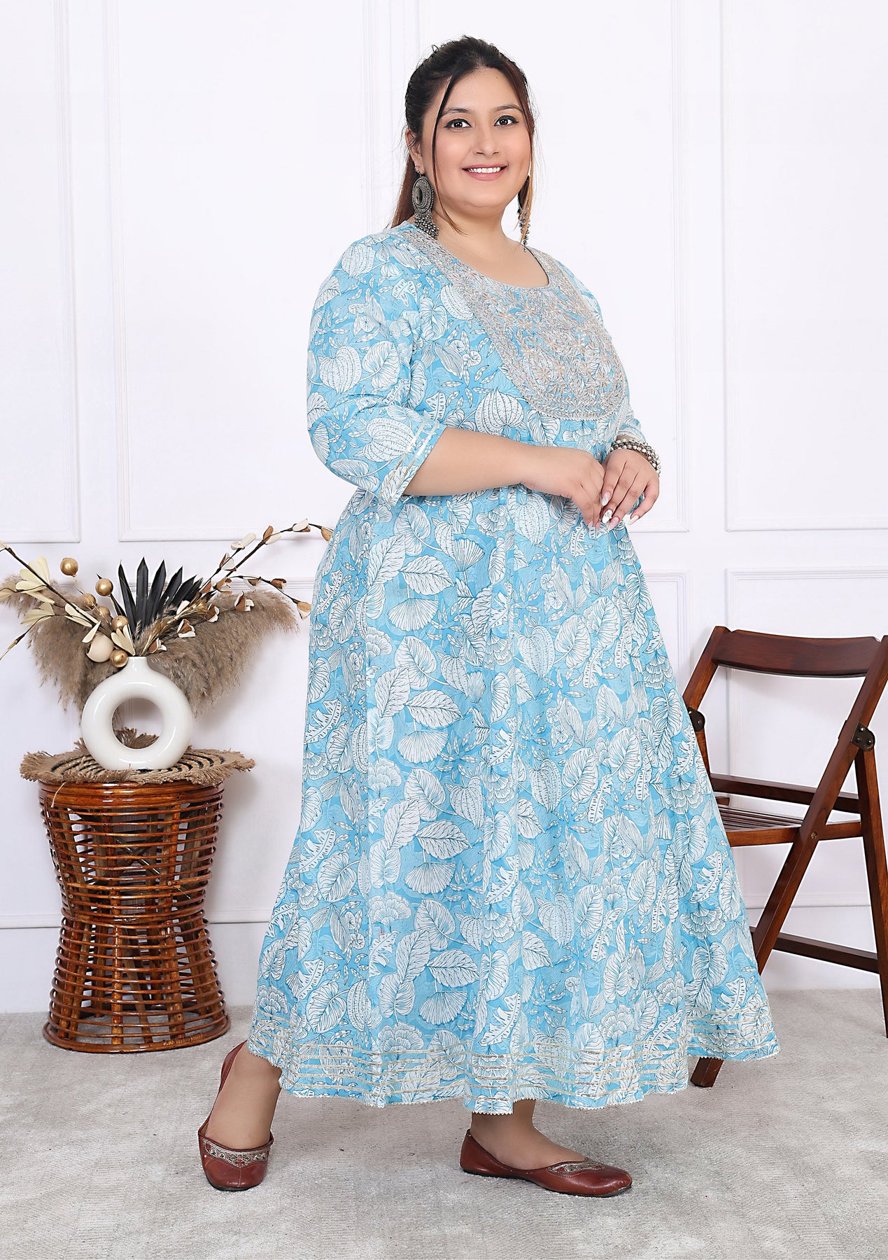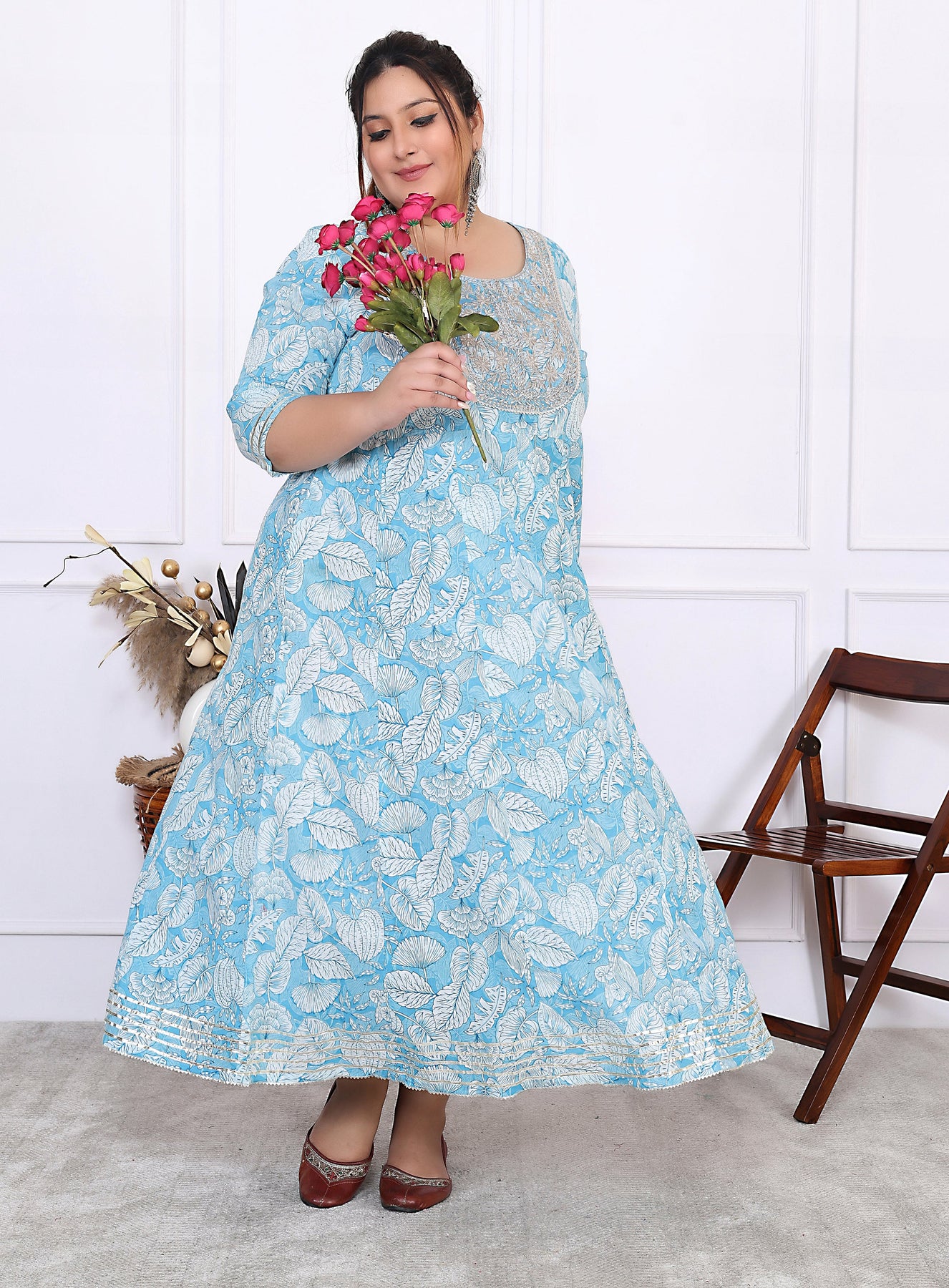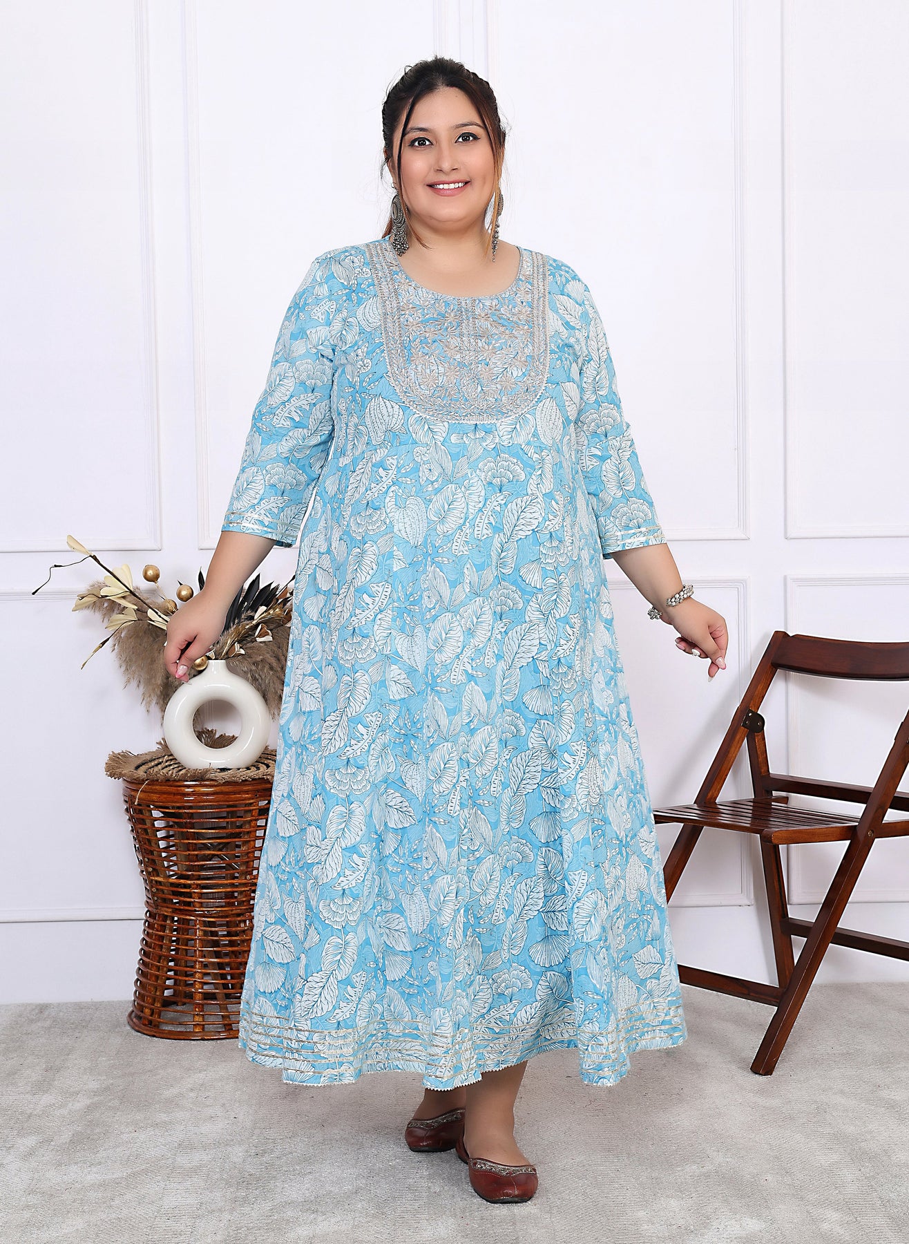 Plus Size Blue Cotton Floral Print Embroidered Gown (B25-Blue)