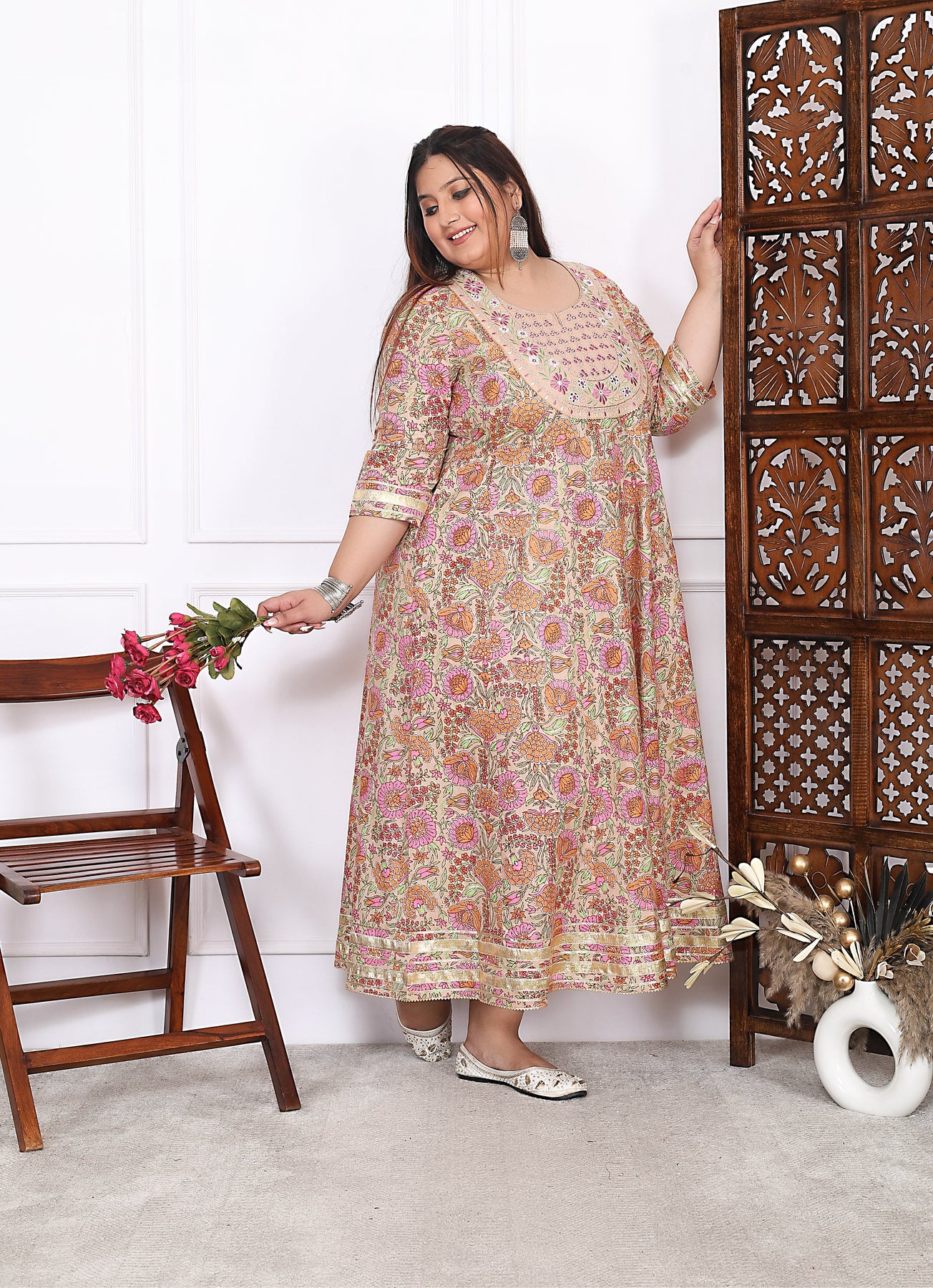 Plus Size Peach Cotton Floral Print Embroidered Long Kurta (B22-Peach)