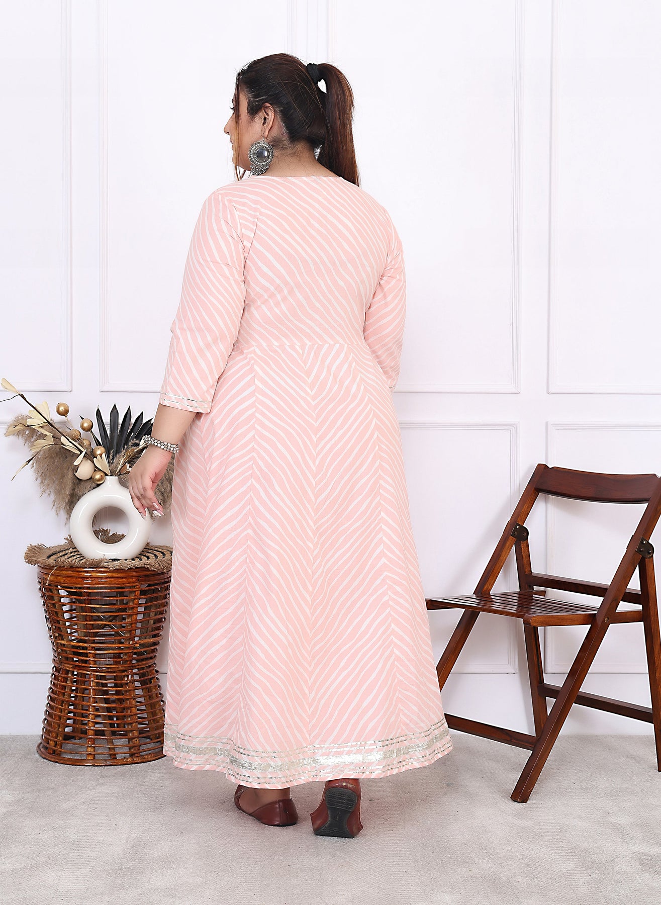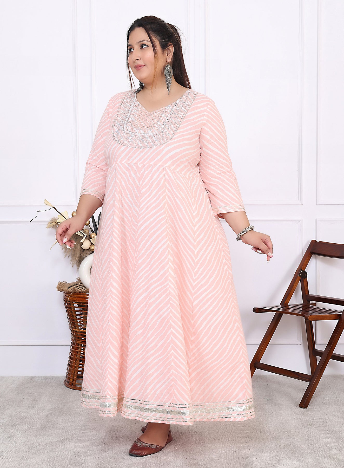 Plus Size Pink Cotton Leheriya Print Embroidered Long Kurta (B16-Pink)