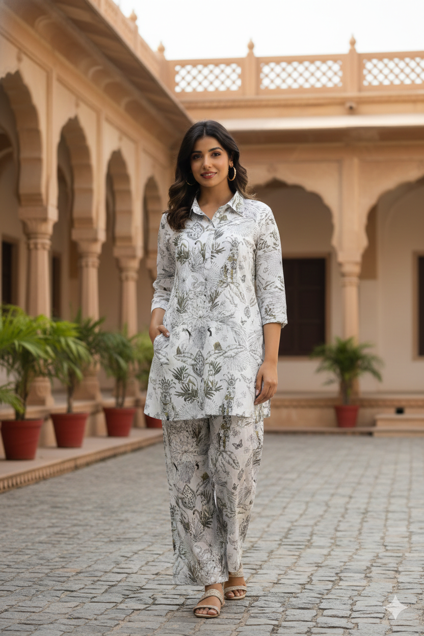 White & Gold Jungle Collared Cotton Lounge Co-Ord Set with 3 button