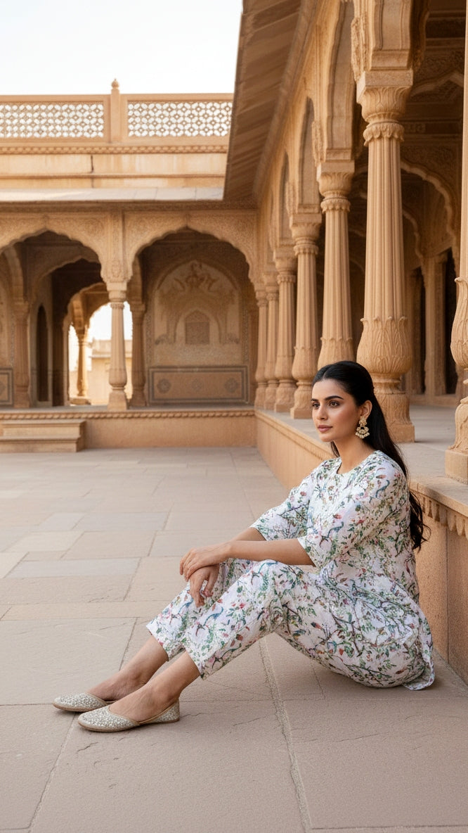 • Embrace bohemian vibes with this paisley print cotton co-ord set. Featuring a relaxed top and trousers with intricate paisley patterns, this set is ideal for casual wear or lounging in style.