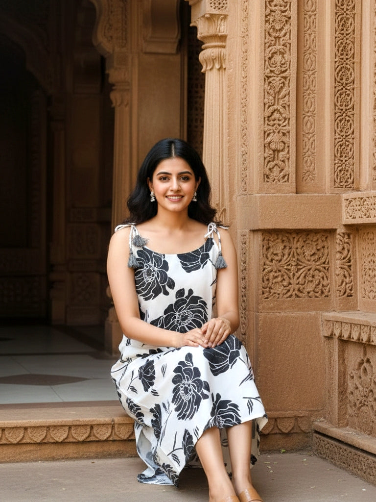 Step into effortless elegance with this Black & White Floral Printed Midi Dress. Crafted from soft, breathable cotton fabric, this dress is designed to keep you comfortable while looking effortlessly stylish. The classic floral print adds a timeless charm, while the sleeveless design with delicate shoulder tie details gives it a modern, feminine touch.