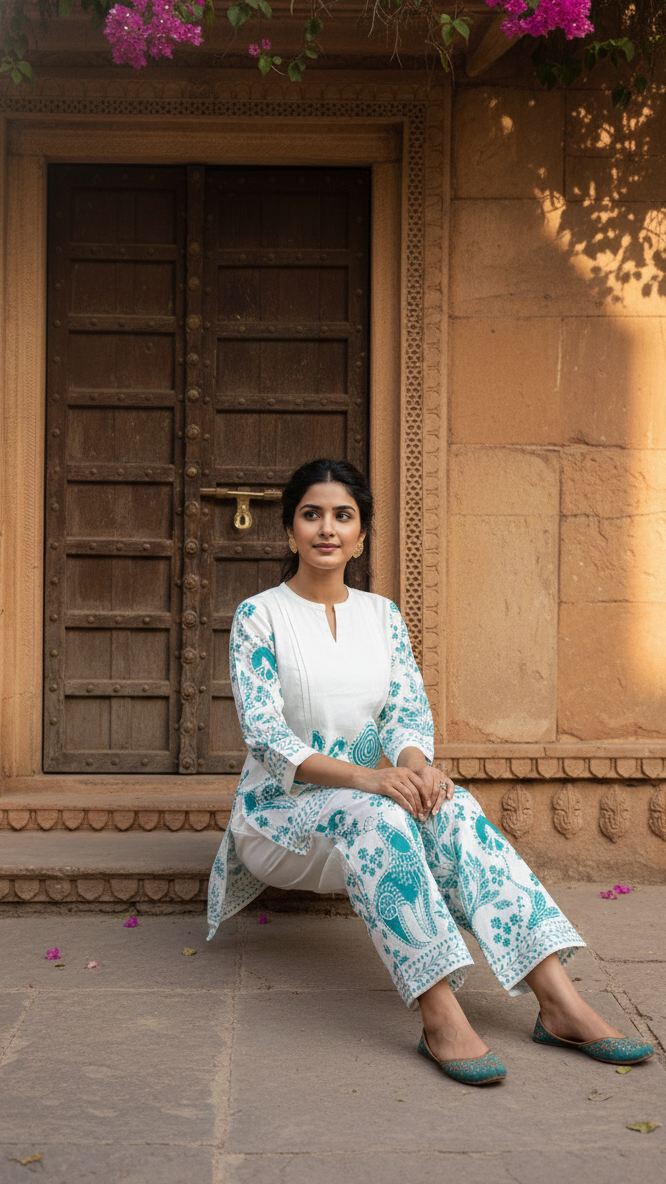 Add a touch of timeless elegance to your everyday wardrobe with this white and teal printed co-ord set, designed for comfort and style. Featuring beautiful floral and ethnic-inspired motifs, this co-ord set comes with a straight-fit silhouette and three-quarter sleeves, making it perfect for casual wear, office looks, and small festive gatherings.