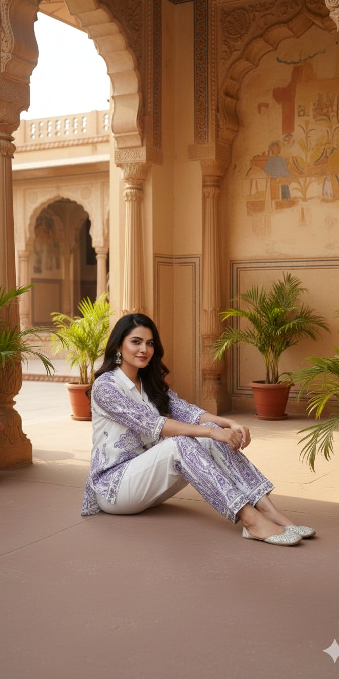 Refresh your ethnic wardrobe with this elegant White & Lavender Printed Cotton Co-Ord Set. Made from soft, breathable cotton fabric, this set features a beautifully printed straight-fit top paired with coordinated comfortable pants. The delicate lavender ethnic motifs on a white base create a graceful and soothing look, perfect for effortless daywear.