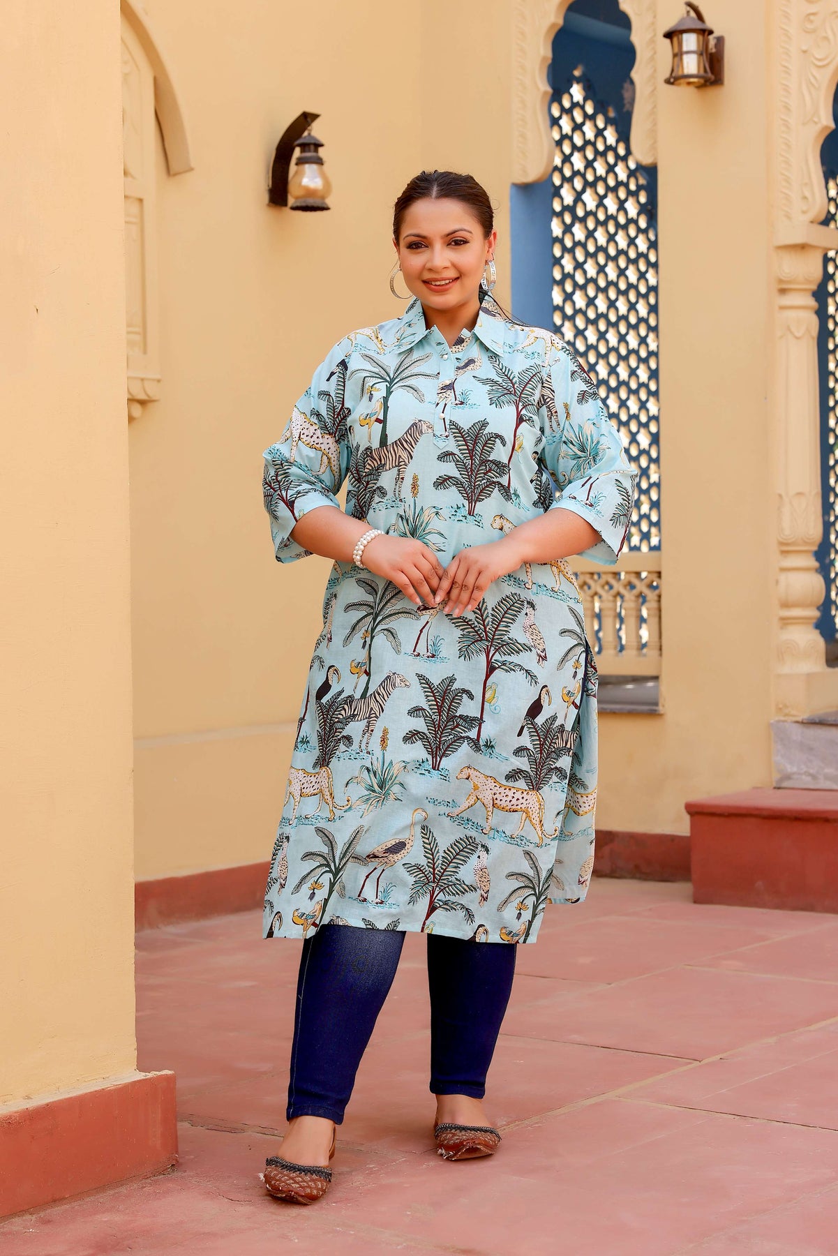 Make a bold yet elegant statement with this sky blue safari-themed kurti featuring playful prints of zebras, cheetahs, birds, and palm trees. Crafted from breathable cotton, this kurti is ideal for casual outings or festive daywear. Pair it with leggings, jeans, or palazzos for a complete ethnic fusion look.
