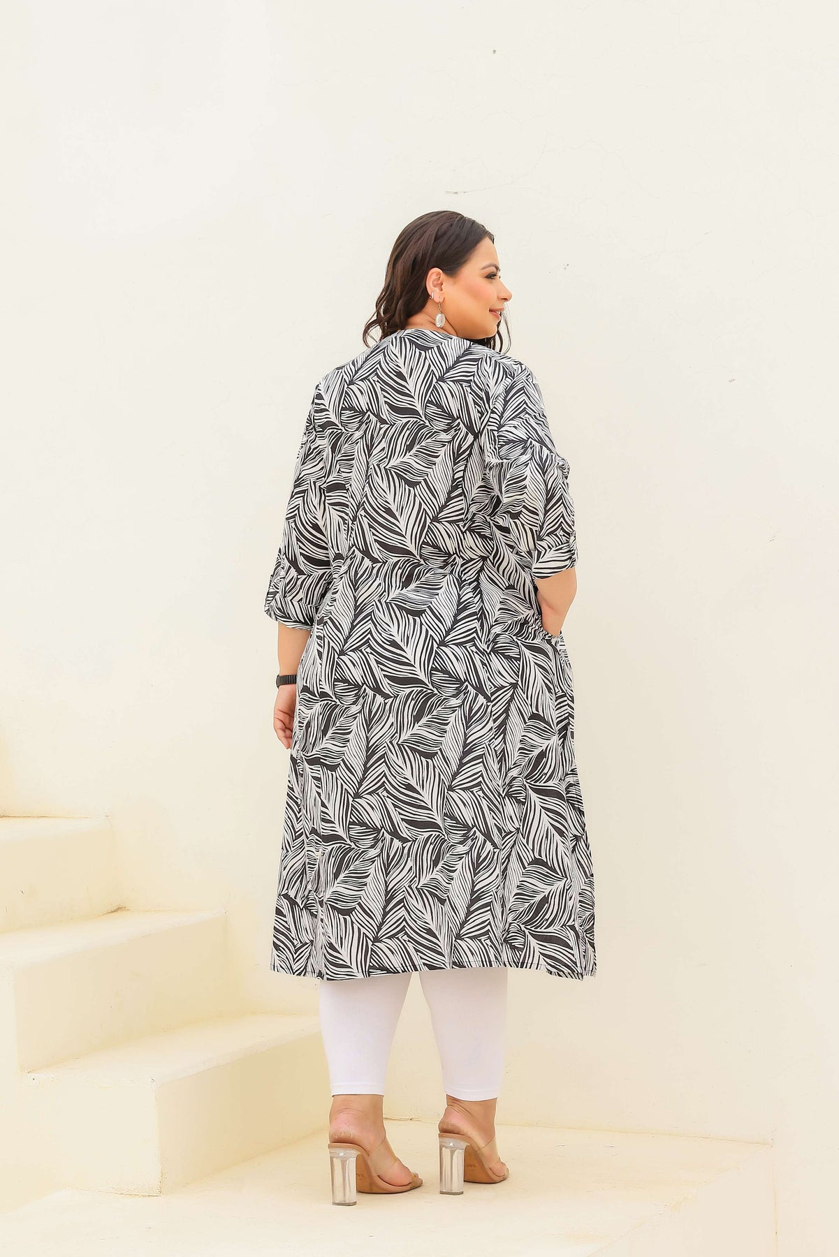 Plus Size Black & White Leaf Print Cotton Kurti for Women