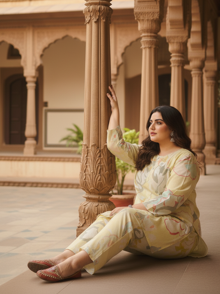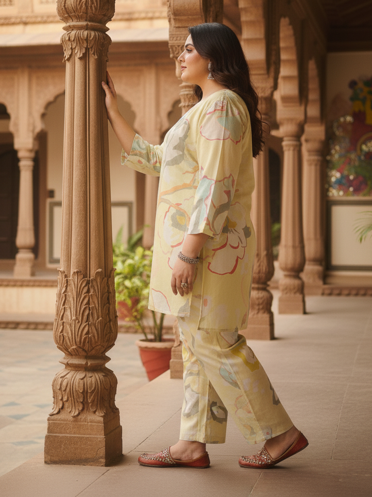 Experience modern elegance with this comfortable Abstract Floral Kurta and Pant Set. This matching two-piece ensemble features a stunning artistic, watercolor-style floral print in gentle pastel shades like Blush Pink or Soft Yellow. The tunic-style kurta has a flattering, slightly A-line cut and a relaxed boat or scoop neckline. Paired with comfortable, straight-fit trousers in the same print, this set is ideal for stylish lounging, casual outings, or sophisticated resort wear.