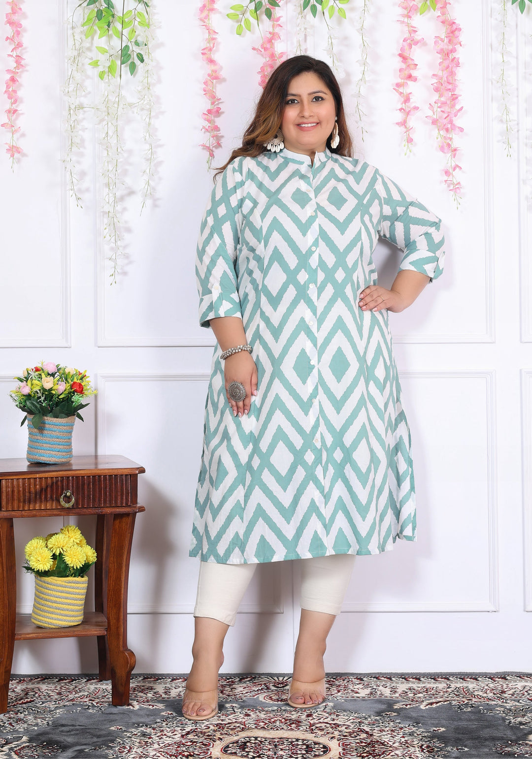 Plus Size Green Cotton Leheriya Print Embroidered Long Kurta (B17-Green)