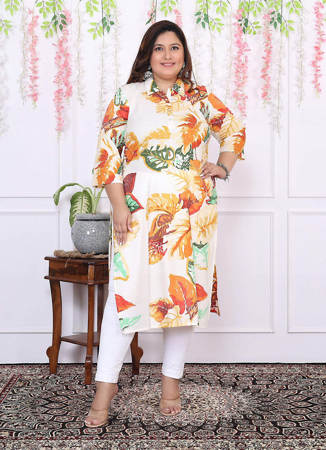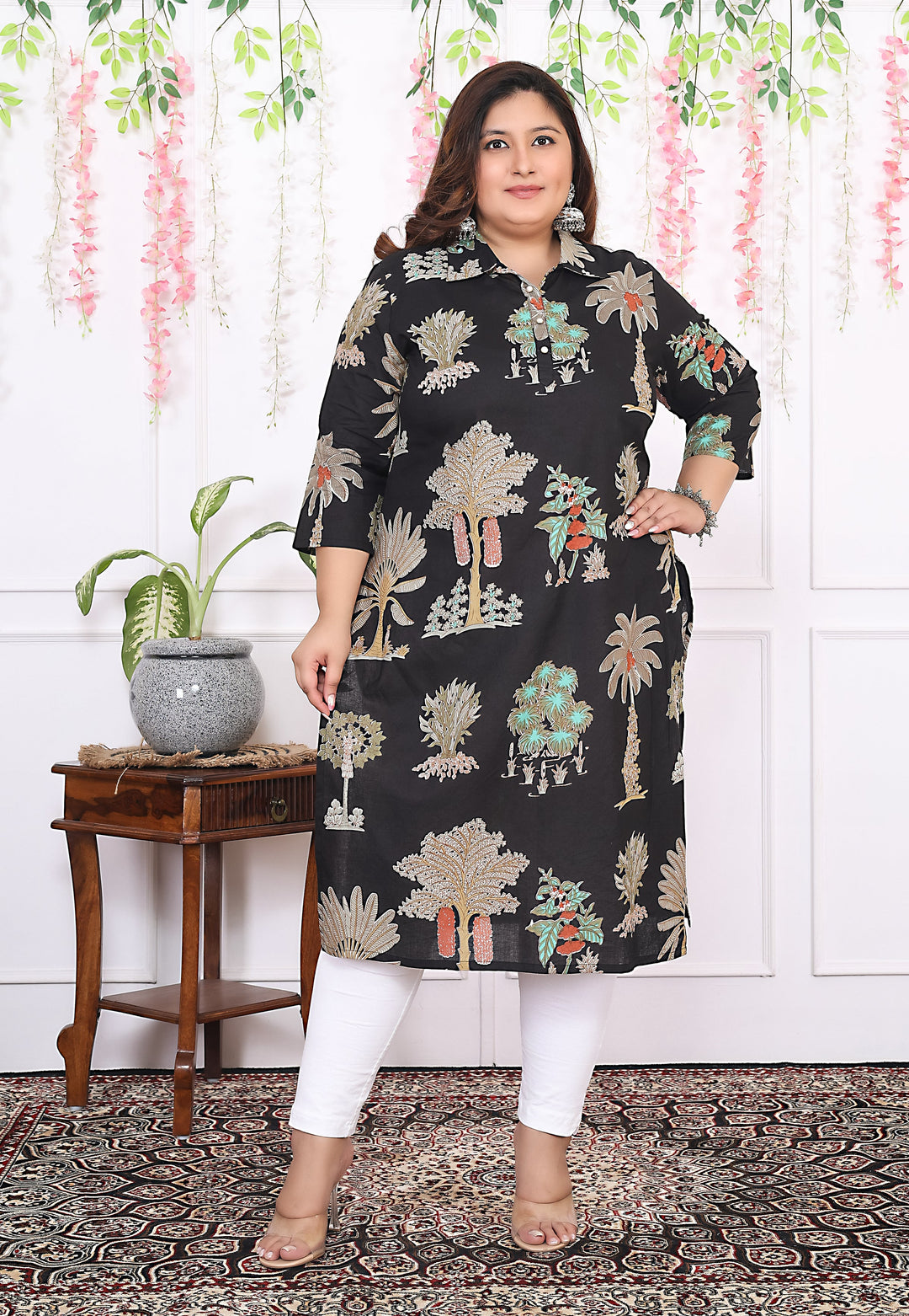 Plus Size Multicolor Cotton Floral Print Embroidered Long Kurta (B19-Multicolor)