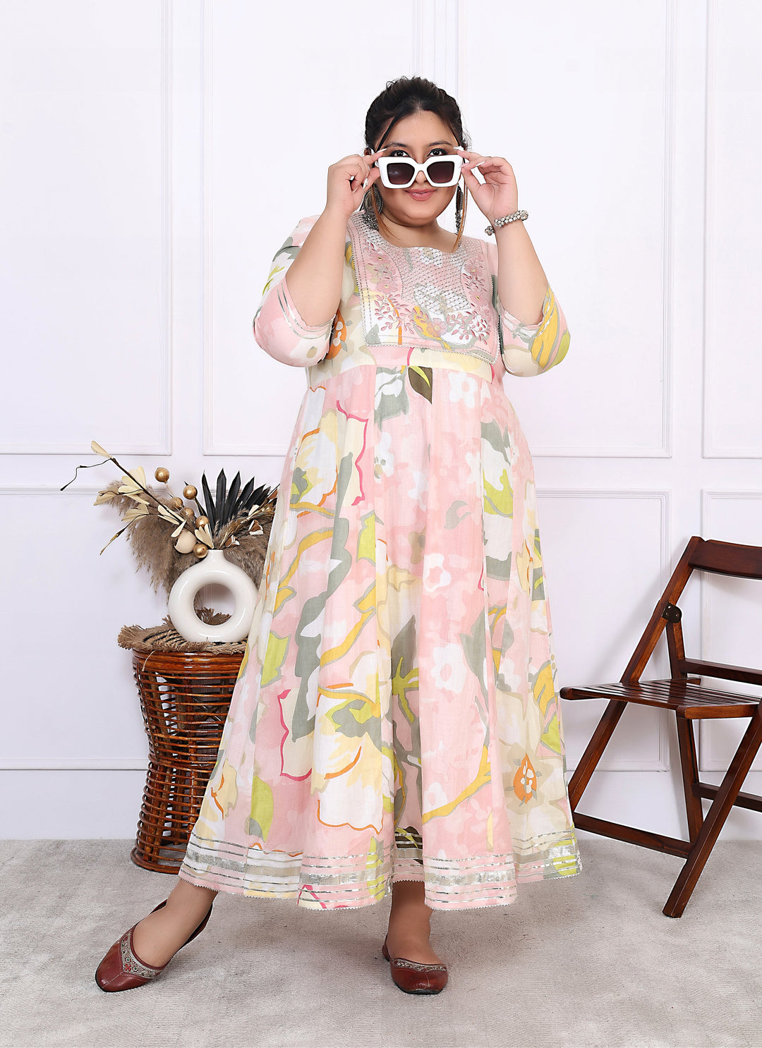 Pink Cotton Comfort Plus-Size Gathered Ethnic Dress