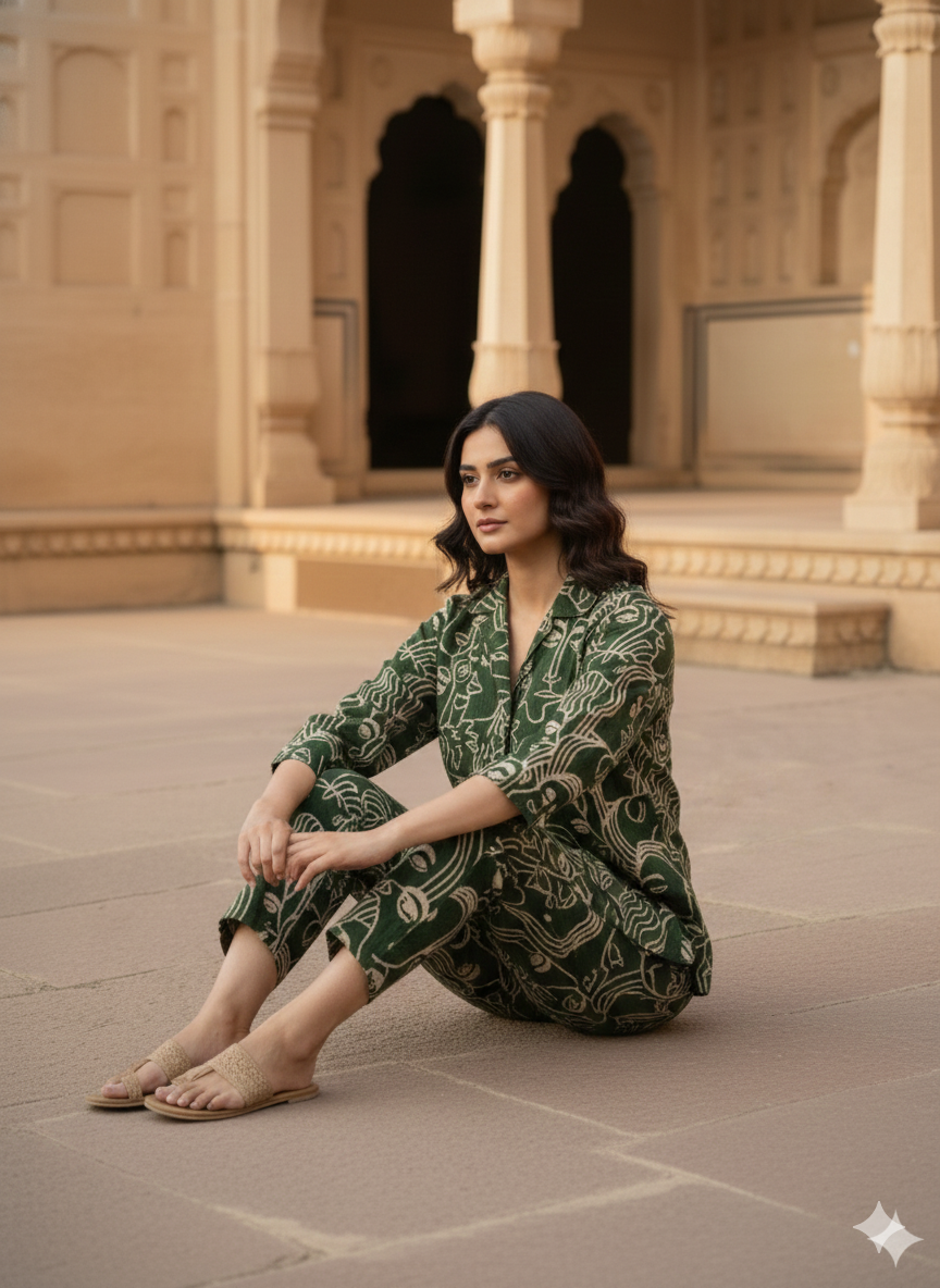 A bold yet elegant co-ord set in GREEN, adorned with abstract BEIGE face prints. Made from breathable cotton-linen, this kurta and pant combo is ideal for casual chic or workwear styling. Front button-down design adds modern structure to artistic charm.